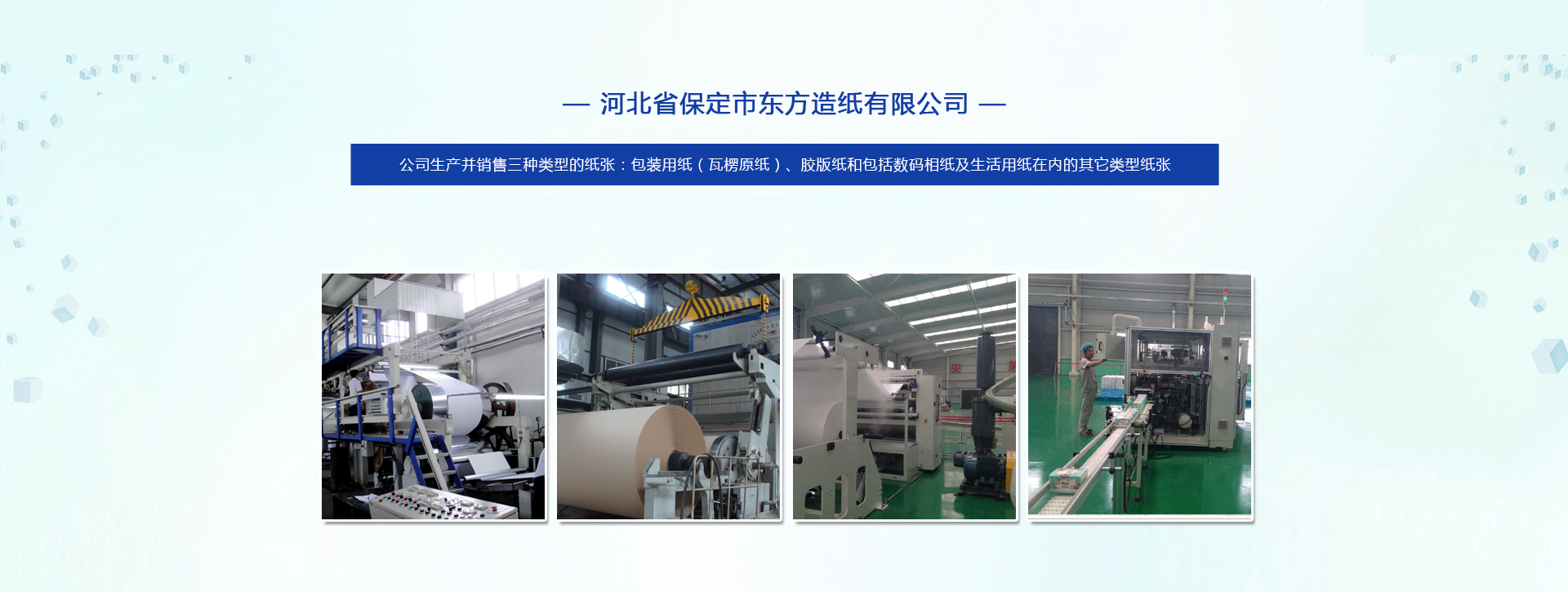 河北省保定市東方造紙有限公司位于河北省保定市,公司利用回收紙作為其主要原材料,生產(chǎn)并銷(xiāo)售三種類(lèi)型的紙張:包裝用紙(瓦楞原紙)、膠版紙和包括數(shù)碼相紙及生活用紙?jiān)趦?nèi)的其它類(lèi)型紙張。